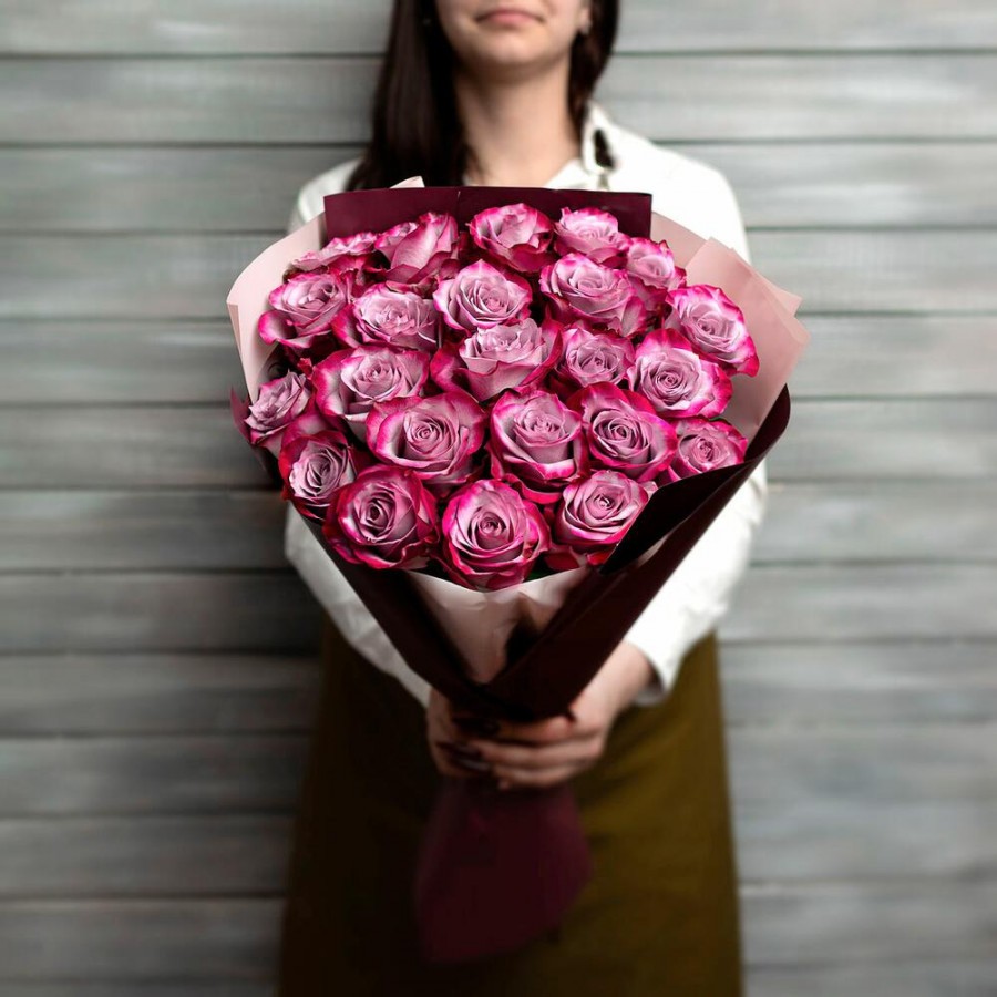 На фото букет из 23 фиолетовых роз. В составе: роза 23 шт, дизайнерская упаковка 1 шт, атласная лента 1 шт, . Все цветы свежие и ароматные, букет красиво оформлен и отлично подходит для подарка. Доступна доставка цветов или самовывоз.