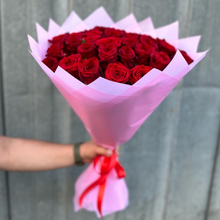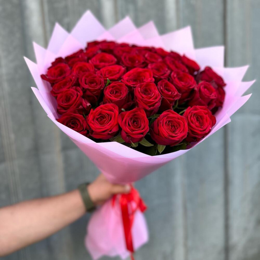 На фото букет из 41 красной розы. В составе: роза 41 шт, дизайнерская упаковка 2 шт, атласная лента 1 шт, . Все цветы свежие и ароматные, букет красиво оформлен и отлично подходит для подарка. Доступна доставка цветов или самовывоз.