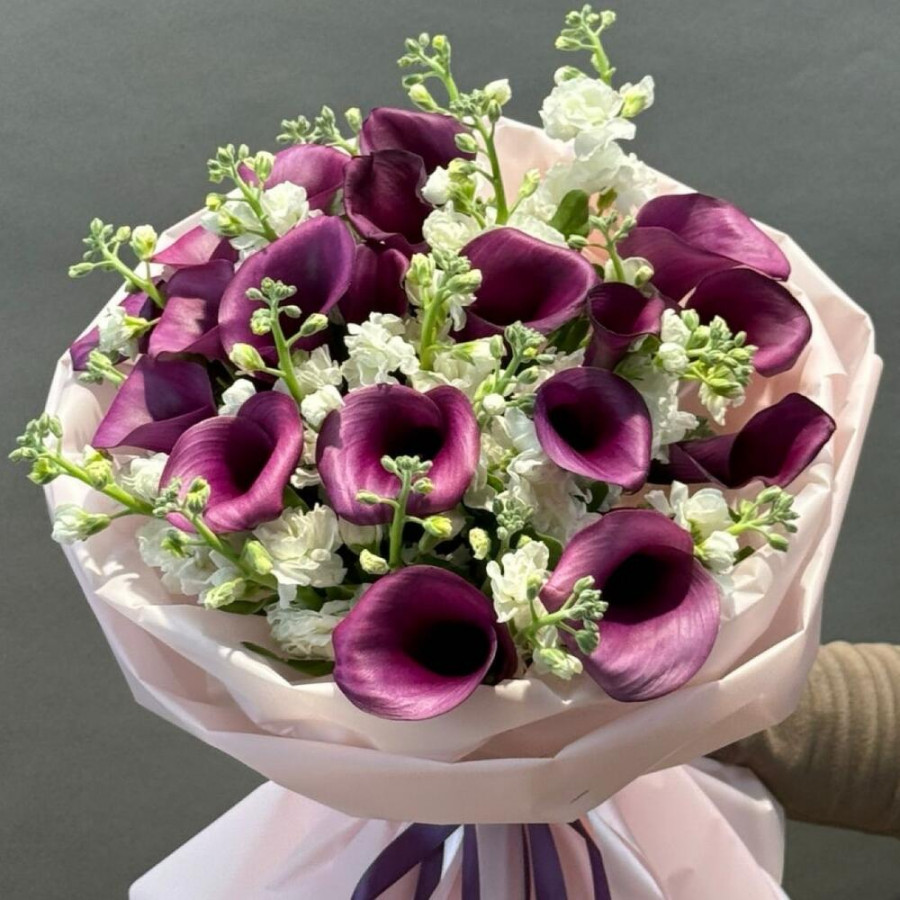 На фото букет «тайна полуночи». В составе: калла 20 шт, маттиола 5 шт, дизайнерская упаковка 1 шт, атласная лента 1 шт, . Все цветы свежие и ароматные, букет красиво оформлен и отлично подходит для подарка. Доступна доставка цветов или самовывоз.
